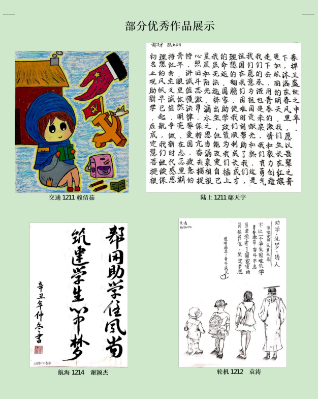 本次“书画比赛”是海运学院资助育人系列活动的拓展活动之一。通过本次活动,扩大了国家、学校资助政策在我院的宣传效果,加强励志教育、诚信教育和社会责任感教育,培养学生自立自强、知恩感恩的良好品质,帮助学生树立青春梦想,让学生在经济上得到帮助,又在精神上得到培养。同时,促进困难学子投身传统文化、人文素养的实践中去,努力成为“德智体美劳”全面发展的高素质人才;以“书画”为纽带,增进困难学子的交流与联系,引导受助学生感恩思源,传递爱心,回报社会。