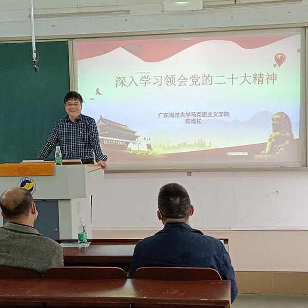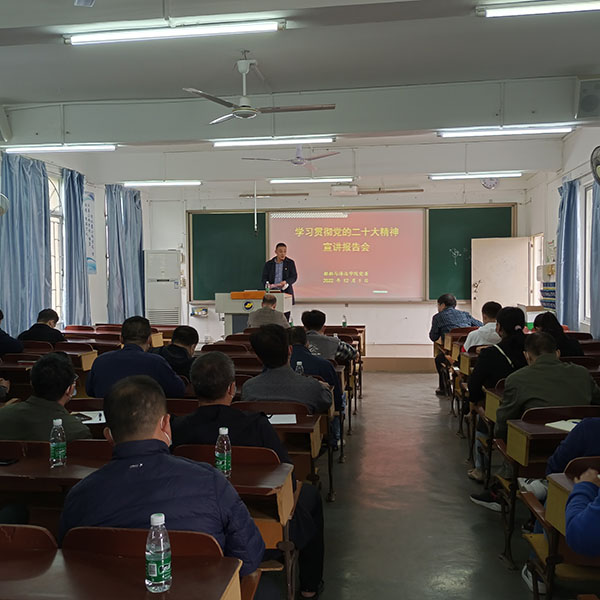 在海滨校区教学楼401教室,召开学习贯彻党的二十大精神宣讲报告会。校党委宣讲团副团长、马克思主义学院党委书记陈青松为大会做报告。报告会由学院党委书记张懿主持,学院全体教职工和学生党员150余人采用线上线下的形式聆听了报告。