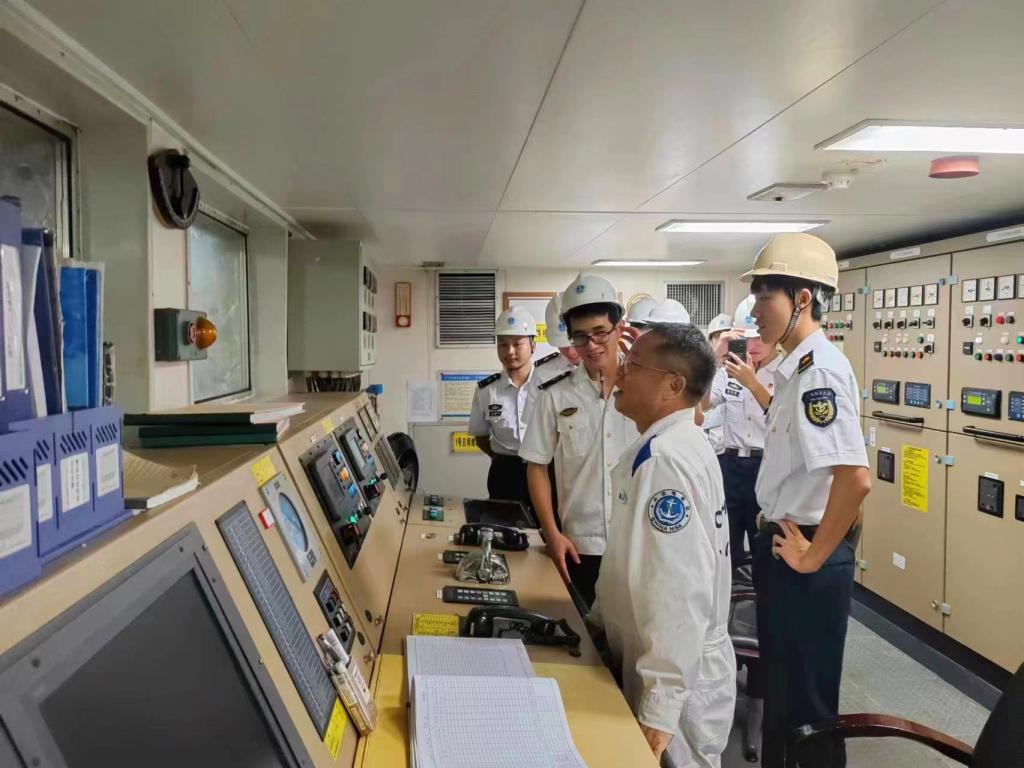 首先,邓平贵等对海巡0925轮及船上安全注意事项进行了讲解,带领同学们参观了轮机舱,驾驶室和甲板,并在海巡0925轮会议室向同学们讲授了海洋环境保护的有关知识。巡航期间,带领同学们参观了湛江港功能区及40万吨码头。