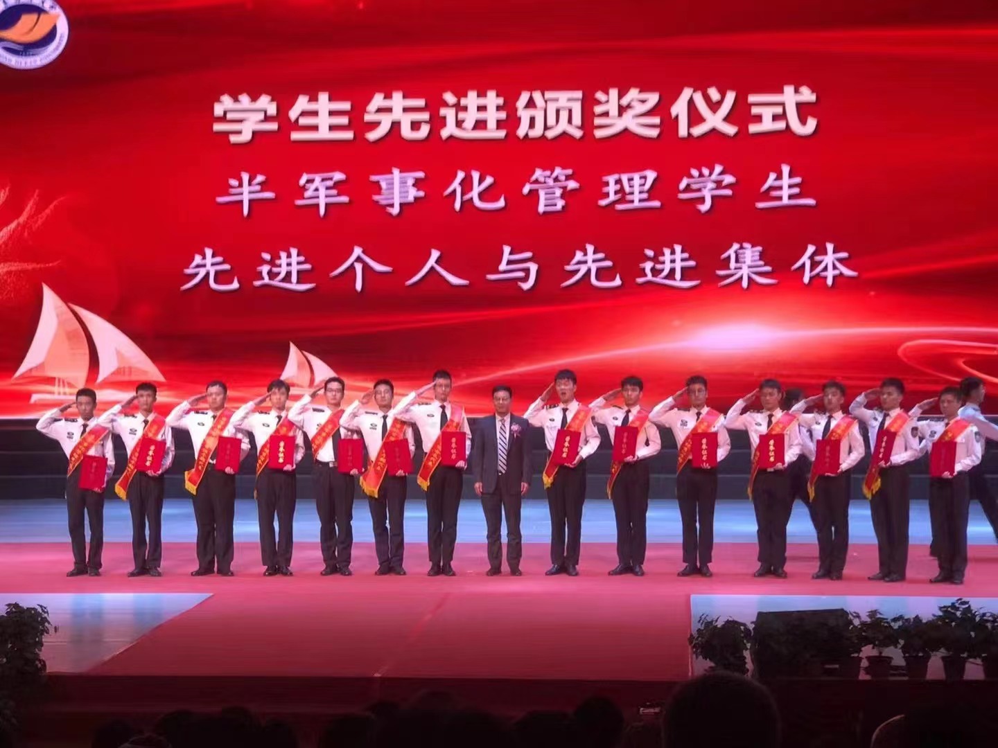 航海类专业半军事化管理先进集体和先进个人,共有14位同学分别获得了:半军事化管理先进区队、优秀学生干部、先进个人、优秀宿舍长的殊荣。