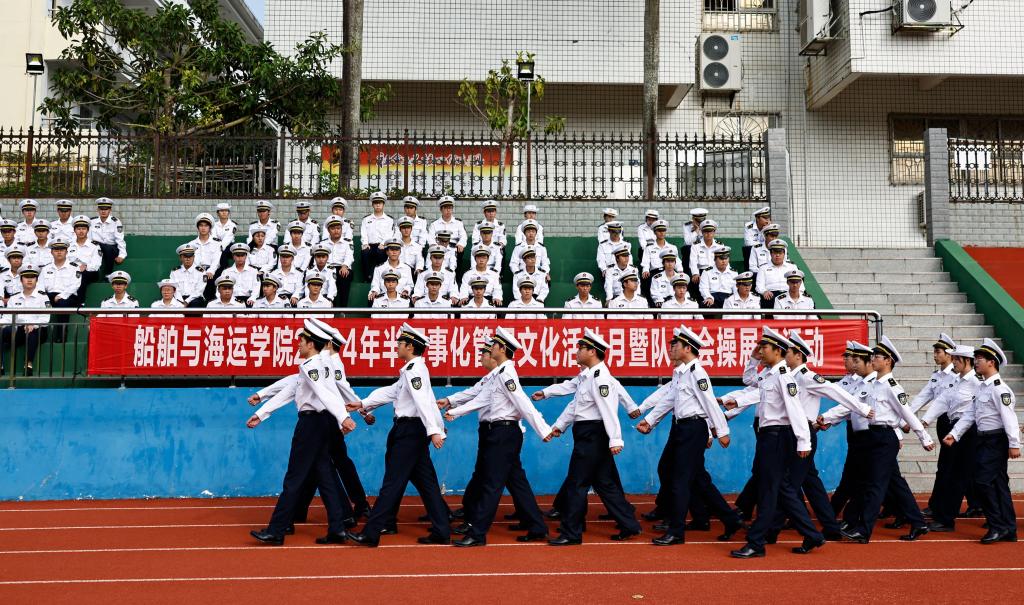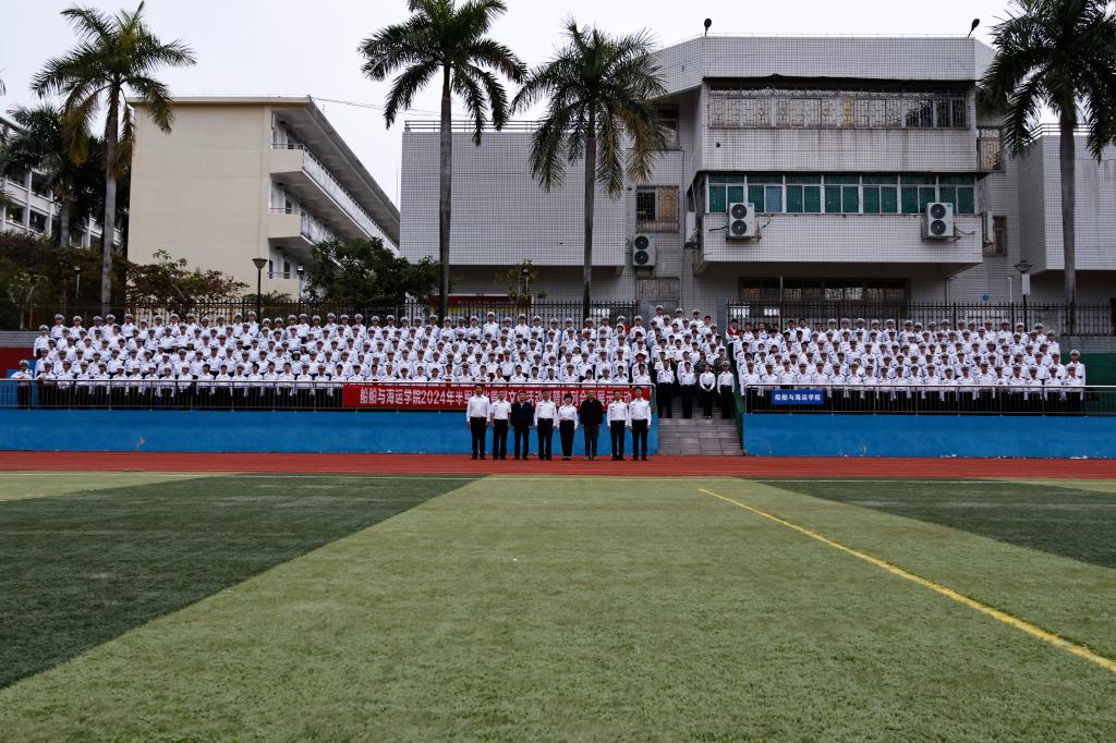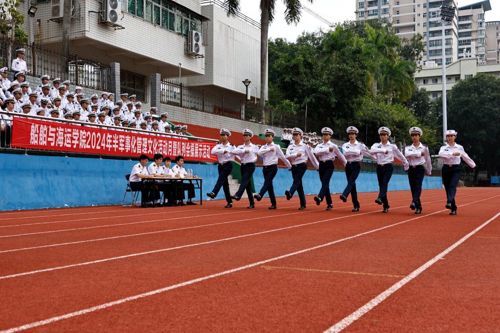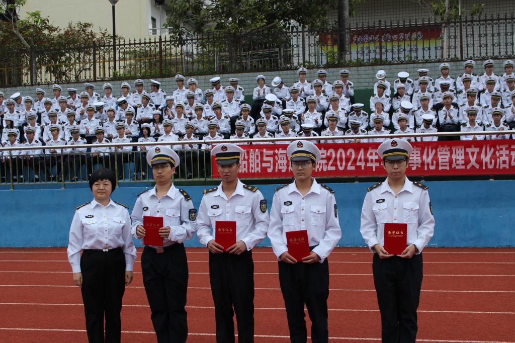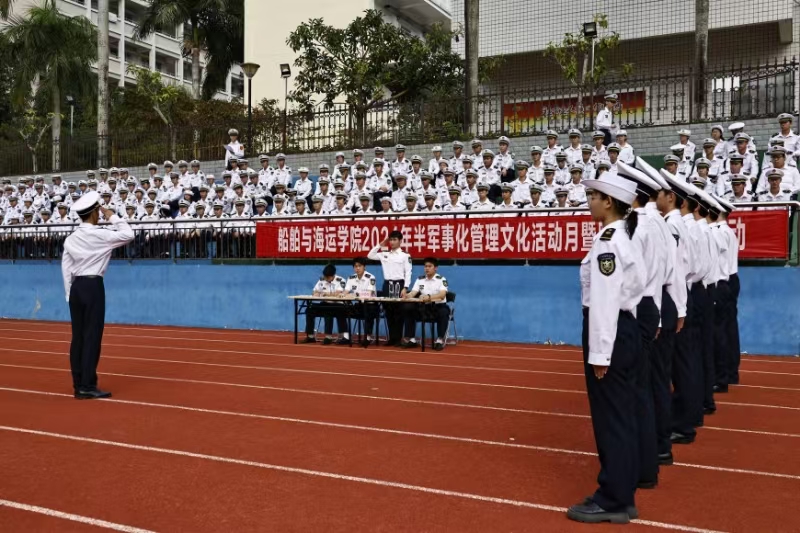 在海滨校区运动场举行了“2024年半军事化管理文化活动月暨队列会操展示活动”。学院党委书记邓朝晖,正处级辅导员、党委副书记齐昊,校学生工作部学生管理科科长王志,校党委武装部军事教育科负责人张亚斌,学院半军管大队长江涛、副大队长吴捍泽,院团委书记郑祯远,辅导员邵建勋及2024级海上专业300余名同学等参加了活动,活动由江涛主持。