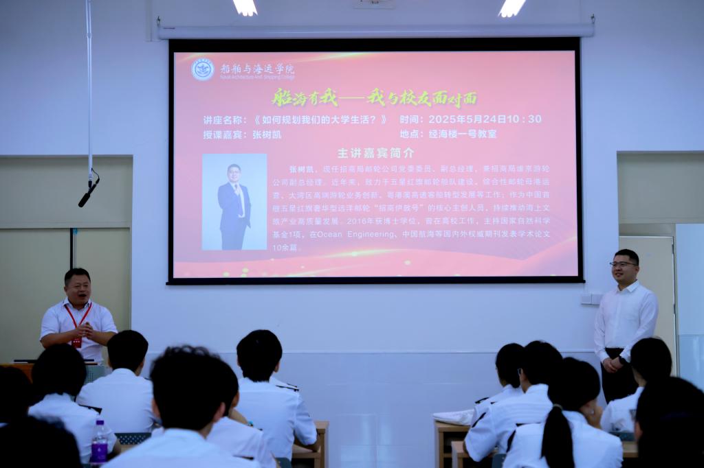 在海滨校区经海楼举办“船海有我——我与校友面对面”活动。活动邀请了招商局邮轮公司党委委员、副总经理张树凯和中科宇创企业集团创始人郑岩宏两位2007级优秀校友分别就职业规划与创新创业进行交流分享。学院领导、老师、辅导员及学生代表200余人参加本次活动。