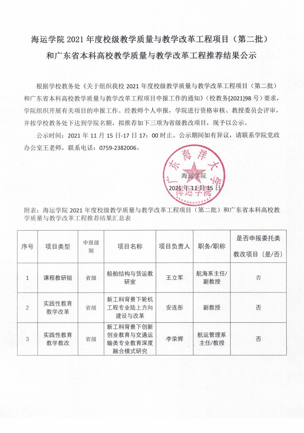 海运学院2021年度校级教学质量与教学改革工程项目(第二批)和广东省本科高校教学质量与教学改革工程推荐结果公示