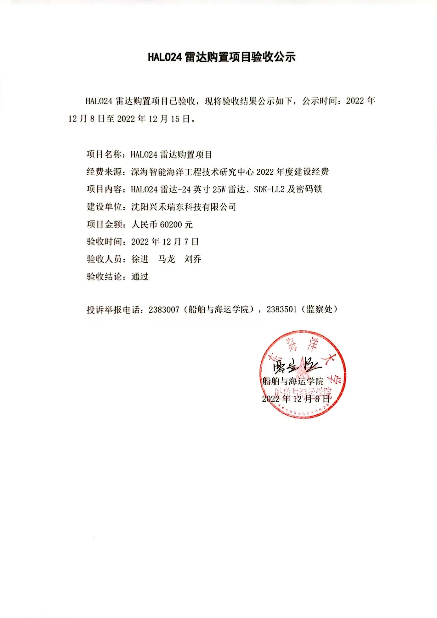 北斗漂流浮标RHW-1、便携式流速流向仪BYD-LX、岸基监控雷达RD-3060、HALO24雷达、大疆经纬 M3T购置项目验收公示