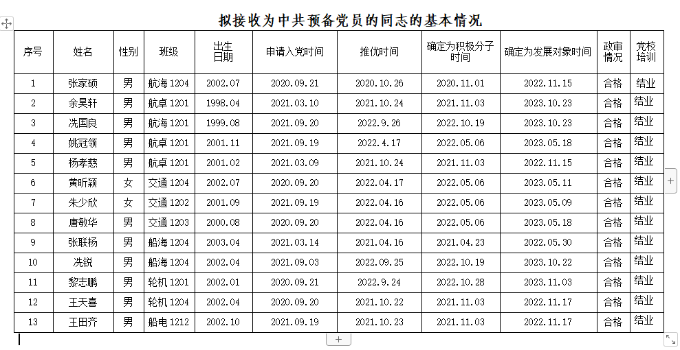发展党员工作实施细则》规定,经本人提出申请,党组织培养考察,支委会审查研究决定,经学院党委预审通过,拟接收冼国良等13名同志为中共预备党员。现将有关情况予以公示,征求党员、群众意见。
