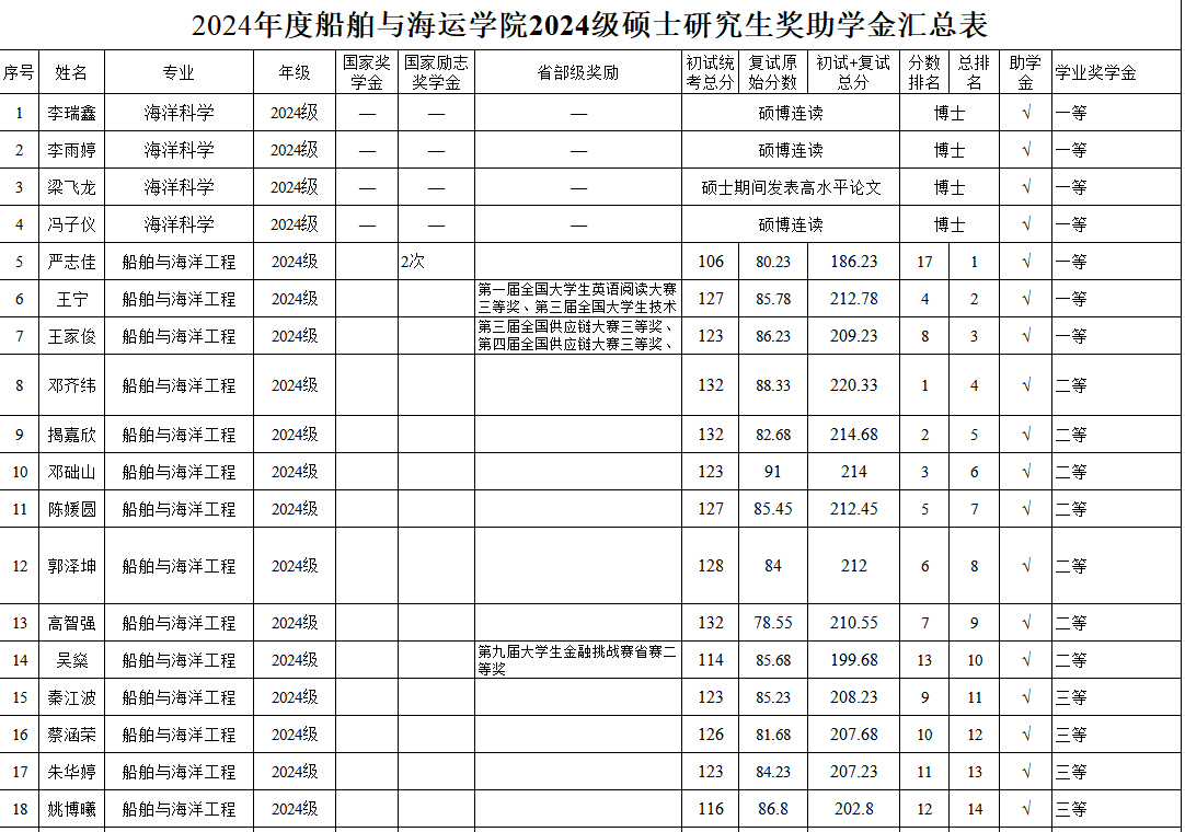 全日制研究生奖助学金实施办法》,经个人申请、学院评审小组认真审核及严格评选,拟确定获得研究生助学金、学业奖学金人员名单。其中,2021级海洋科学专业皮桂源同学因休学补发半年助学金,其余硕士研究生均不分等级全部获得助学金。现将评审名单进行公示(详见附表)。